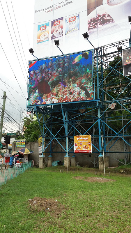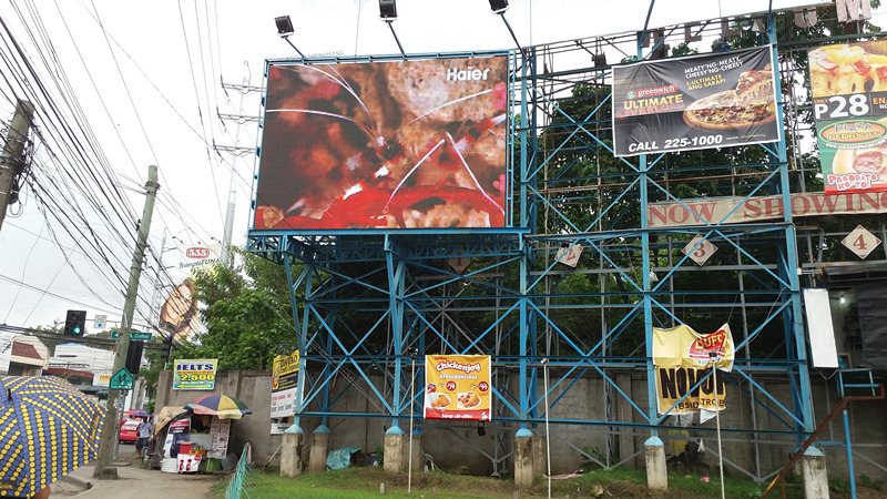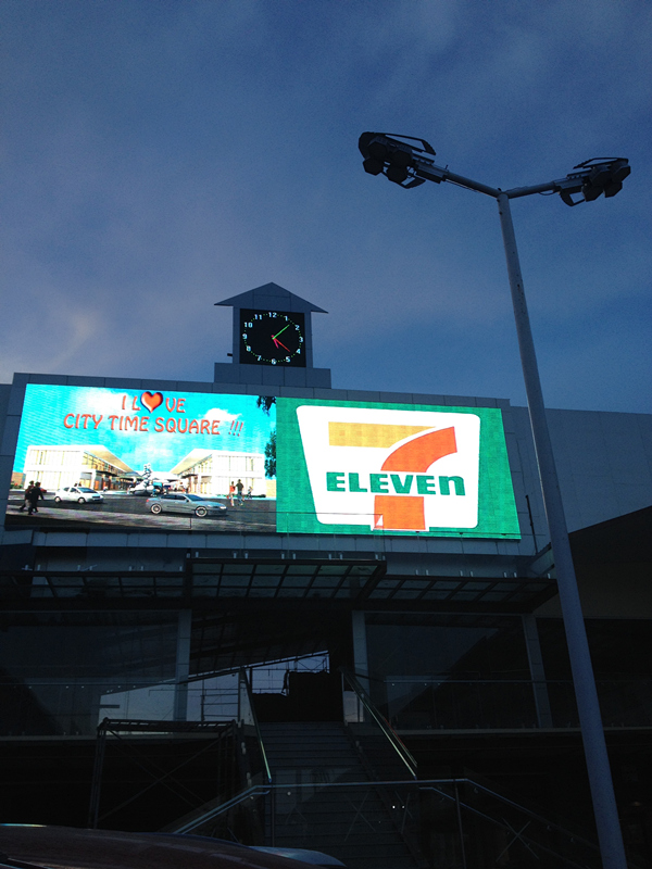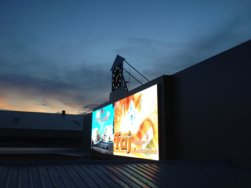 中间为户外P10全彩50M²,两边各有数十个不规则的P16全彩拼接而成。